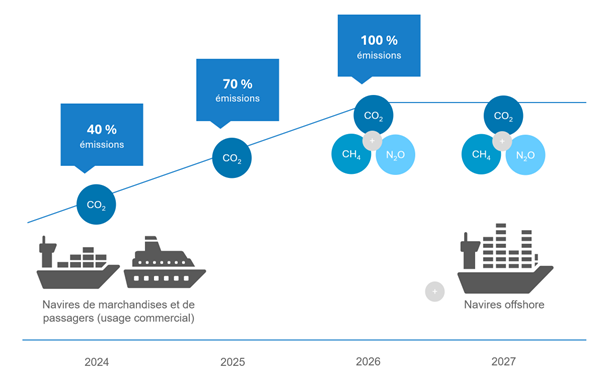Au fil des ans, l'EU ETS s'est étendu pour couvrir davantage de secteurs et de gaz. Initialement axé sur les industries à forte intensité énergétique, il a progressivement inclus d'autres secteurs comme l'aviation, avec le secteur maritime comme sa plus récente addition. Il sera progressivement intégré à l'EU ETS d'ici 2026. Pour 2024, 40 % des émissions vérifiées des navires devront initialement être couvertes par des EUAs, en 2025 ce sera 70 % et à partir de 2026, 100 % des émissions devront être couvertes par des EUAs.